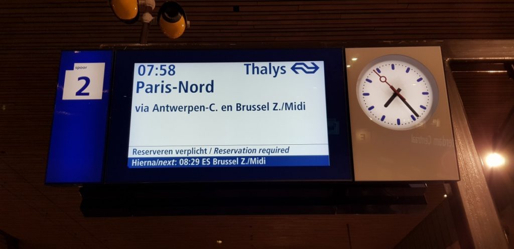 Vandaag is het eindelijk zo ver, wij gaan naar Disneyland Parijs! De wekker gaat vroeg. Het is kwart voor 6 als we ons bed uit stappen. Gelukkig hebben wij ons ontbijt de dag ervoor al klaargemaakt. We kleden ons aan en pakken de laatste spullen. Met de koffers lopen wij naar de bushalte. Om 6.38 uur gaat de bus naar Laan van NOI waar wij om 6.54 uur de trein nemen naar Rotterdam Centraal. Het is al best druk in de trein met mensen die onderweg zijn naar hun werk. De trein rijdt mooi op tijd en om 7.18 uur komen wij aan op Rotterdam Centraal. We gaan alvast kijken bij het spoor waar de Thalys zal vertrekken. Vervolgens besluiten we wat winkels te bekijken die al vroeg open zijn. Het is 7.54 uur als de Thalys het station binnen komt rijden. Helaas klopte de aanduiding van de wagons niet op het perron en moeten wij ons nog een flink stuk naar het einde van het spoor haasten. Gelukkig was er tijd genoeg om nog even een fotootje te maken. We zoeken onze plekken en gooien onze koffers boven in het rek. Ronald zit aan het gangpad en ik zit bij het raampje. De trein rijdt al vrij snel boven de 200 km/uur. Onderweg luisteren we muziek, spelen we spelletjes op mijn Nintendo DS en genieten we van het uitzicht. Daarnaast heeft Ronald alvast de treinkaartjes gekocht voor Paris Gare du Nord naar Marne-la-Vallée – Chessy. De eerste halte is Antwerpen en de tweede stop is Bruxelles zuid Midi. Al snel was het te merken dat de trein 300 km/uur ging. Bij de laatste halte op Paris Gare du Nord stappen wij met al onze spullen uit de trein. Het perron is smal en het is erg druk. We lopen richting de trap en komen midden in het station uit. Helaas stond daar niet meteen een bordje met: ‘De trein naar Disneyland’, dus werd het nog even puzzelen. Er is natuurlijk geen enkele medewerker die Engels spreekt… Gelukkig is Ronald vrij snel van begrip en hebben wij na 10 minuten de juiste trein gevonden. We moesten eerst één halte naar Châtelet – Les Halles en daar overstappen op de trein richting Marne-la-Vallée – Chessy. De tweede trein deed er ongeveer 40 minuten over. Vol spanning zat ik de haltes af te tellen tot de trein eindelijk bij de halte van Disneyland was.