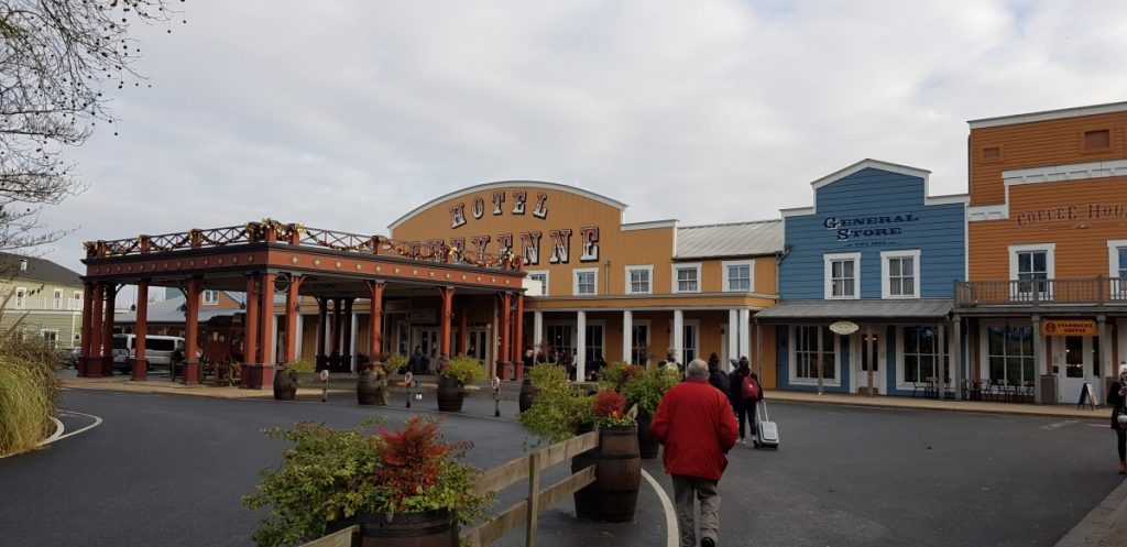 Buiten het station staan we meteen voor Disney Village. Dit is het gebied waar alle winkels en restaurants van Disneyland zitten, net voor het pretpark. We nemen meteen de bus naar ons hotel, hotel Cheyenne. De bus doet 5 minuten over de rit en vertrekt elke 10 minuten. Het hotel is helemaal in het thema van het Wilde Westen/Toy Story. We kunnen meteen inchecken en gelukkig is onze kamer al beschikbaar. Het is een nette en ruime kamer. We eten even een broodje en leggen onze spullen neer. Vervolgens nemen wij de bus terug naar Disney Village. Het is leuk om alles eindelijk in het echt te zien, na alle foto’s en filmpjes die ik al kende. Als eerst moeten we door de beveiliging. De tassen moeten op een lopende band en we zelf moeten we door detectiepoortjes. Dit moet altijd als je het gebied van Disney binnen wilt komen. We bekijken wat winkels in Disney Village. Het zijn veel bekende eettentjes, restaurants en souvenirwinkels. Je kan het zo gek niet bedenken, maar alles is er te koop. Mits je bereid bent om de hoofdprijs te betalen.